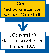 Nach der Entdeckung der Yttererde im Gadolinit (1794) vermuteten Jöns Jacob Berzelius und Wilhelm Hisinger (1766-1852, Mineraloge und Geologe, Eigentümer des Bastnäs-Feldes in Riddarhyttan), dass diese auch im »schweren Stein von Bastnäs« enthalten sei. Ihre Vermutung bestätigte sich nicht. Stattdessen erhielten sie im Jahre 1803 nach sorgfältiger Abtrennung des Silicats und des Eisens eine weiße Substanz, die nach dem Ausglühen braun wurde, obwohl kein Eisen mehr darin enthalten war. Damit war eine neue »Erde«, also das Oxid eines bis dato unbekannten Elements, entdeckt. Berzelius und Hisinger nannten das neue Element »Cerium« - nach dem im Jahre 1801 entdeckten Planetoiden Ceres. Das Mineral erhielt entsprechend den Namen »Cerit«, die neu entdeckte Erde den Namen »Ceriterde« (oder »Ceria«). Unabhängig von Berzelius und Hisinger und etwa zur gleichen Zeit entdeckte Martin Heinrich Klaproth in Berlin in einer ihm übersandten Probe ebenfalls das neue Element. Sein Namensvorschlag lautete »Ochroit«, abgeleitet von dem griechischen Wort »ochros« für gelb-braun.