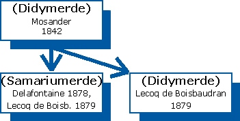 Für einige Jahrzehnte glaubte man an die Existenz eines Elementes Didymium. Auch Mendelejew verzeichnete es in seinem Periodensystem von 1869 mit dem Symbol Di und einer Atommasse von 138 (Siehe: Mendelejews Original Periodensystem). Der Schweizer Chemiker Marc Delafontaine (1838-1911) fand bei der Untersuchung von Didymerde 1878 zwei neue blaue Spektrallinien, die er einem neuem Element zuordnete, das er Decipium nannte. 1879 konnte Paul Émile Lecoq de Boisbaudran aus der Didymerde unter Zuhilfenahme spektroskopischer Methoden die Samariumerde abtrennen. Er gewann die Didymerde aus dem in Russland gefundenen Mineral Samarskit, was die Namensgebung für das Element erklärt. Das Decipium Delafontaines war ein Gemisch von Samarium mit den anderen in der Didymerde enthaltenen Elementen. (Fortsetzung: Samarium)