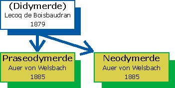 Für das Element mit den grün gefärbten Salzen bildete Auer von Welsbach den Namen »Praseo-Didymium«, was so viel wie »lauchgrüner Zwilling« bedeutet, während er für das rosafarbene Salze liefernde Element den Namen »Neo-Didymium« (»neuer Zwilling«) wählte. Praseo-Didymium und Neo-Didymium wurden später zu Praseodym bzw. Neodym verkürzt.