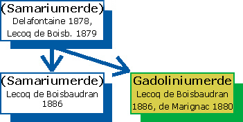 Nach der Abtrennung der Samariumerde konnte Lecoq de Boisbaudran 1886 aus dieser als weitere Erde die Gadoliniumerde abtrennen. Diese Erde war identisch mit einer 1880 von Jean-Charles Galissard de Marignac aus dem Samarskit isolierten Erde. Mit Zustimmung de Marignacs benannte Lecoq de Boisbaudran die neue Erde zu Ehren von Johan Gadolin. Bezeichnenderweise wurde das in der Mitte der Lanthanoidenreihe stehende Gadolinium sowohl von Lecoq de Boisbaudran durch Abtrennung aus der Samariumerde als auch von de Marignac aus der Terbinerde gefunden, wobei erstere die leichteren, letztere die schwereren Seltenerdmetalle enthält. (Siehe auch: Abtrennung aus der Terbinerde)