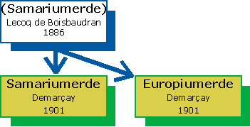1886 entdeckte Sir William Crookes im Spektrum des Minerals Samarskit eine bis dahin nicht zuzuordnende Wellenlänge. Eine Linie gleicher Wellenlänge konnte er bei der Spektralanalyse eines Gemisches von Yttererde und Samariumerde beobachten. Crookes vermutete ein neues Element, gab diesem aber zunächst nur die Arbeitsbezeichnung »S-alpha«. 1892 erhielt Lecoq de Boisbaudran von Per Theodor Cleve aus Schweden 3 Gramm gereinigte Samariumerde. Bei deren Untersuchung fand er mehrere neue Linien. Die von ihm vermuteten neuen Elemente nannte er vorläufig »Z-epsilon« und »Z-zeta«. 1896, nach mühevollen Arbeiten zur Abtrennung des gesuchten Elements aus Samariumerde, konnte Eugène-Anatole Demarçay dessen Spektrallinien deutlich erkennen und verkündete die Existenz eines Elements zwischen Samarium und Gadolinium, dem er zunächst den Namen »Sigma« gab. 1901 konnte er nach weiteren fraktionierten Kristallisationen schließlich die neue Europiumerde abtrennen und erhielt damit auch die reine Samariumerde. Später stellte sich heraus, dass sowohl »S-alpha« von Crookes als auch »Z-epsilon« und »Z-zeta« von Lecoq de Boisbaudran als auch »Sigma« von Demarçay das Element Europium betreffen.