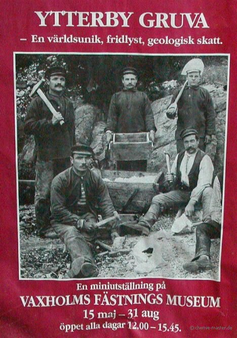 Im »Kastellet«, der ehemaligen Marinebasis vor Vaxholm, wird eine kleine Ausstellung zur Ytterby gruva gezeigt: »Ytterby gruva. Ein in der Welt einmaliges, geschütztes geologisches Kleinod.« |