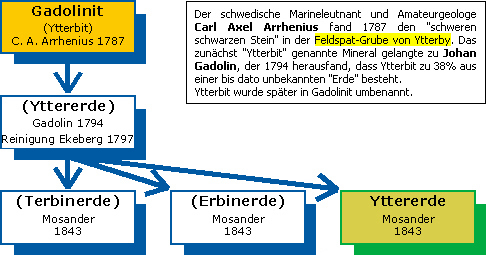 Berühmt wurde die Ytterby-Grube aber nicht wegen des abgebauten Feldspats, sondern wegen der darin enthaltenen »Beimengungen«. Dem in Vaxholm stationierten schwedischen Marineleutnant Carl Axel Arrhenius gebührt das Verdienst, als Amateurmineraloge 1787 als erster auf den in der Grube gefundenen »schweren schwarzen Stein« aufmerksam geworden zu sein. Leutnant Arrhenius - nicht zu verwechseln mit dem Chemiker Svante Arrhenius - verfügte über gute Kontakte zur akademischen Welt und so gelangte der »Ytterbit« genannte schwarze Stein zu Professor Johan Gadolin von der Universität Åbo (finnisch: Turku). Bei einer für die damalige Zeit sehr komplizierten Analyse fand Gadolin 1794 heraus, dass Ytterbit zu 38% aus einer bisher unbekannten »Erde« besteht. Die Oxide der Metalle nannte man damals »Erden«. Die neu entdeckte Erde erhielt den Namen »Yttererde« (oder »Yttria«). Mit ihrer Entdeckung war die Tür zur Entdeckung der »Seltenen Erden« aufgestoßen. Das Mineral Ytterbit wurde 1800 zu Ehren Gadolins in Gadolinit umbenannt. Gadolinit hat folgende Zusammensetzung: Y2FeBe2[O|SiO4]2, wobei Yttrium durch andere Seltenerdmetalle ersetzt sein kann.