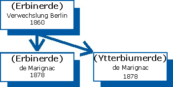 1860 nahm der schwedische Chemiker Nils Johan Berlin (1812-1891) erneut Untersuchungen an Ekebergs Yttererde vor. Berlin fand bei seiner Analyse neben Yttrium nur noch die Erde, die die rosafarbenen Salze lieferte. Diese nannte er an Stelle von Terbia jetzt Erbia. Diese Umbennung behielten alle nachfolgenden Forscher bei. Die Arbeit Berlins hatte gravierende Folgen, zumal die richtigen Ergebnisse Mosanders wieder in Frage gestellt wurden. Es kam in der Folgezeit zu vielen falschen Schlüssen und auch Fehlentdeckungen. Namhafte Chemiker wie Robert Wilhelm Bunsen oder Per Theodor Cleve zweifelten ebenfalls die Existenz von Mosanders Erbia an. 1862 fand Marc Delafontaine in der Yttererde doch wieder die Erde, die das gelbe Peroxid lieferte, also das Erbia Mosanders. Da aber der Name Erbium seit Berlin schon umgedeutet war, führte Delafontaine 1864 bzw. 1878 den Namen Terbia ein für die das gelbe Peroxid liefernde Erde, also für das Erbia Mosanders. Damit war die Verwechslung perfekt. In den Siebzigerjahren des 19. Jahrhunderts meinte der amerikanische Mineraloge und Chemiker J. Lawrence Smith, in der Yttererde ein neues Element gefunden zu haben, das er Mosandrium nannte. Mosandrium jedoch erwies sich nach Lecoq de Boisbaudran als ein Gemisch mehrerer Erden (Terbium, Gadolinium und Samarium) bzw. nach de Marignac als Terbiumoxid. Delafontaine glaubte, in aus Samarskit gewonnener Terbinerde zwei neue Elemente gefunden zu haben und nannte sie Philippium und Decipium. (Fortsetzung: Erbium)