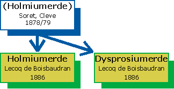 In der Holmiumerde fand Paul Émile Lecoq de Boisbaudran 1886 mittels Spektralanalyse noch eine weitere Erde, die er nach dem griechische Wort »dysprosodos« für »unzugänglich, schwer zugänglich« benannte. Durch fraktionierte Kristallisation trennte er die Dysprosiumerde von der Holmiumerde ab. Die Entdeckung des Elements 66 (Dysprosium) wurde 1878 von dem Schweizer Chemiker Marc Delafontaine gemeldet. Er nannte das vermeintlich neue Element »Philippium«. Dies erwies sich aber in der Folgezeit als ein Gemisch aus Erbium und Terbium.