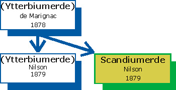 Ein Jahr nach der Abtrennung der Ytterbiumerde aus der Erbinerde trennte Lars Fredrik Nilson 1879 aus dieser das Scandium ab. Die Existenz des Elements wurde 1871 von Mendelejew als »Eka-Bor« vorhergesagt. Per Theodor Cleve überprüfte noch im Jahr der Entdeckung die Eigenschaften des Scandiums und konnte so die Übereinstimmung mit dem »Eka-Bor« Mendelejews bestätigen.