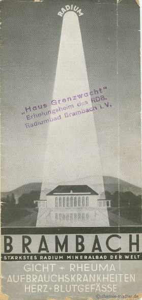 In Unkenntnis der von den radioaktiven Strahlen ausgehenden Gefahren wurden ärztlicherseits Trinkkuren mit sehr stark verdünnten wässrigen Lösungen von Radiumsalzen empfohlen.