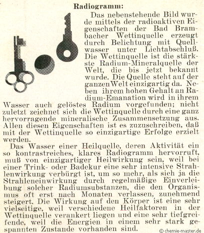Das neu entdeckte, stark strahlende Radium bot einen Ausweg. Die radioaktive Strahlung zeigt bei Einwirkung auf Haut und Gewebe die gleichen Effekte wie die Röntgenstrahlung. Durch Einschmelzen von festen Radiumsalzen wie Radiumbromid, Radiumchlorid oder Radiumsulfat in Ampullen gewann man Strahlenquellen, die leicht auch an schwer zugänglichen Stellen des Körpers eingesetzt werden konnten. Ja sogar unter die Haut ließen sich derartige Strahlenquellen verpflanzen. Wässrige Radiumsalz-Lösungen wurden auch zu Einspritzungen in bösartige Geschwulste verwendet. Die einsetzende Nachfrage nach Radiumpräparaten hatte eine enorme Preissteigerung für das nur in geringen Mengen zu gewinnende Element zur Folge. Was lag angesichts dieser geglaubten »Heilwirkung« des Radiums näher als dieses in umfassender Weise als »Medizin« einzusetzen? Schon vor der Entdeckung der Radioaktivität hatte man das »Joachimsthaler Grubenwasser« als Mittel gegen Gicht und Rheumatismus verwendet. Noch nach dem ersten Weltkrieg wurde das radiumhaltige Grubenwasser in speziellen Nahrungsmitteln, wie zum Beispiel dem »Radium-Zwieback«, verarbeitet.