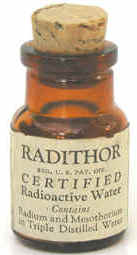 Der Hersteller des Produkts, die Firma Bailey Radium Laboratories in East Orange, New Jersey, USA, garantierte eine Aktivität der beiden Radiumisotope von mindestens jeweils 1 Mikrocurie und bot demjenigen, der den Nachweis erbringen könne, dass ihr »Radithor« weniger als die genannte Strahlungsaktivität aufweisen sollte, eine Summe von 1000 US-Dollar. Bailey Radium Laboratories musste diese Summe nie auszahlen. Unzweifelhaft ist der Tod des amerikanischen Geschäftsmannes und Golf-Champions Eben Byers mit der Anwendung von »Radithor« verknüpft. 1928 begann Byers auf Empfehlung seines Arztes mit der Einnahme von »Radithor« zum Auskurieren einer Unfallverletzung. Auch nach Ausheilung der Verletzung behielt Byers die »milde« Radiumtherapie bei und trank durchschnittlich drei Flaschen »Radithor« täglich. Erst nach dem Auftreten von Zahnausfall und von Wunden an der Schädeldecke beendete Byers im Jahre 1930 die »Radithor«-Anwendung. Sein Tod im Jahre 1932 alarmierte die Mediziner und die Öffentlichkeit. Erst jetzt begann endlich die breite Öffentlichkeit, die von solcher Art missbräuchlicher Verwendung des Radiums ausgehenden Gefahren zu erkennen.